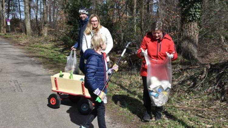 In Bruckhausen war Erika Kosch mit einem Teil ihrer Familie auf dem Voerder Weg, dem Saatweg und dem Bruckhausener Weg im Einsatz. Dies ist ihr gern genutzter Wanderweg, den sie gut kennt. „Am meisten stören mich die vielen Flaschen. Das ist ja wie ein Rotweinwanderweg“, scherzt die Bruckhausenerin. „Heute sammeln wir hier, damit es demnächst wieder schön ist“, erklärt sie die Aktion, bei der auch Tochter, Schwiegersohn und Enkel Luke angepackt haben.